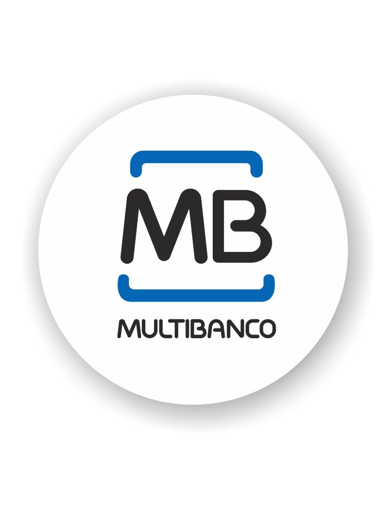 Autocolante vinil com o logótipo de pagamento por Multibanco. Ideal para aplicação em montras, balcões ou perto de terminais de pagamento, informando os clientes da disponibilidade deste método de pagamento.