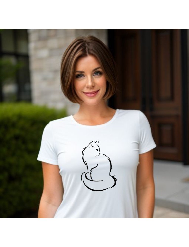 T-shirt feminina de algodão branco com estampa de um gato em destaque, ideal para quem adora um look descontraído com um toque felino. O design é simples, elegante e pensado para oferecer conforto e estilo no dia a dia.