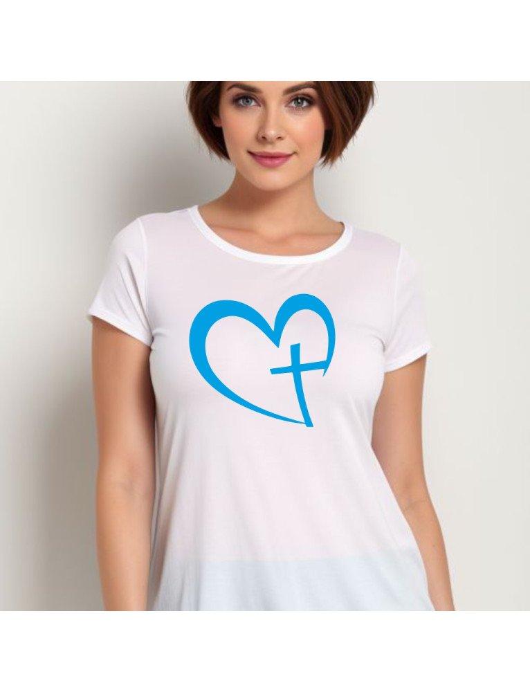 Esta T-shirt branca de senhora, com um coração e uma cruz em azul, é a escolha ideal para quem quer transmitir uma mensagem de fé e espiritualidade de uma forma moderna e cheia de estilo. Uma peça básica, mas poderosa, que combina com qualquer look casual.