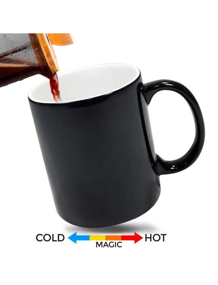 Caneca preta que reage ao calor mostrando a imagem impressa