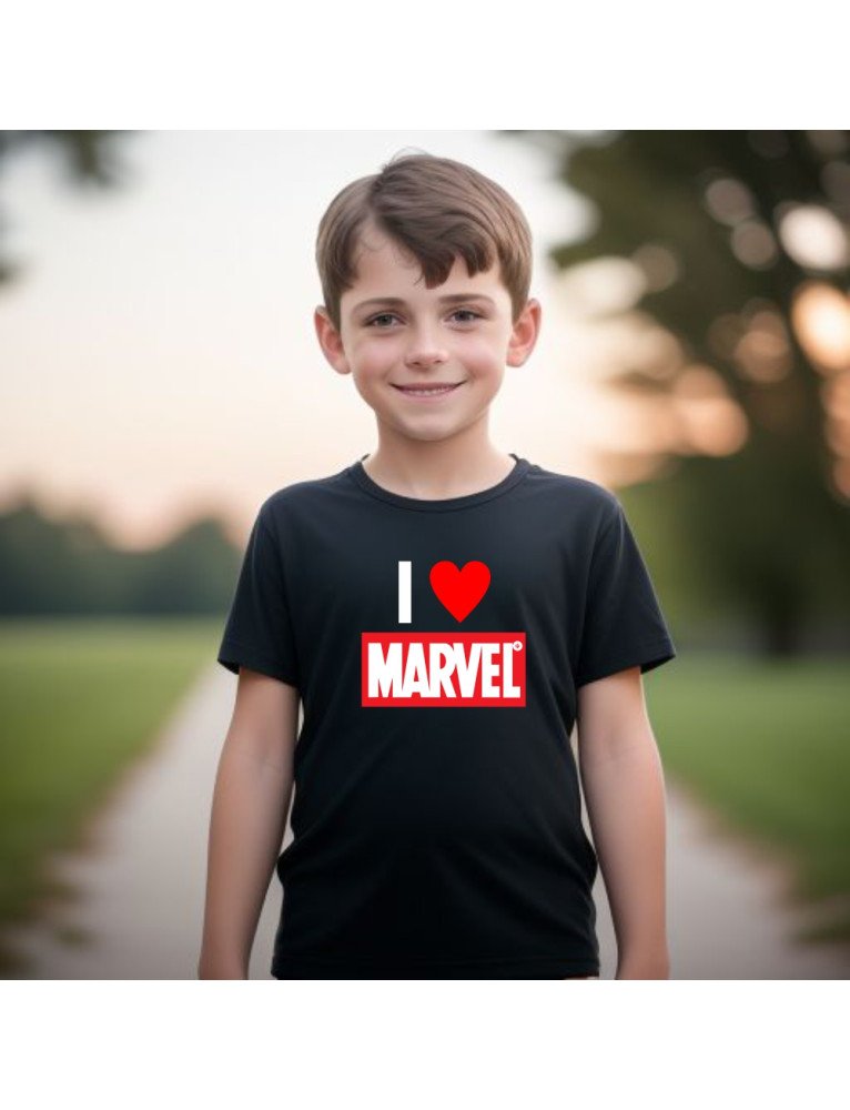 Veste a T-shirt I Love Marvel e leva o teu herói interior contigo – porque cada dia pode ser uma nova aventura!